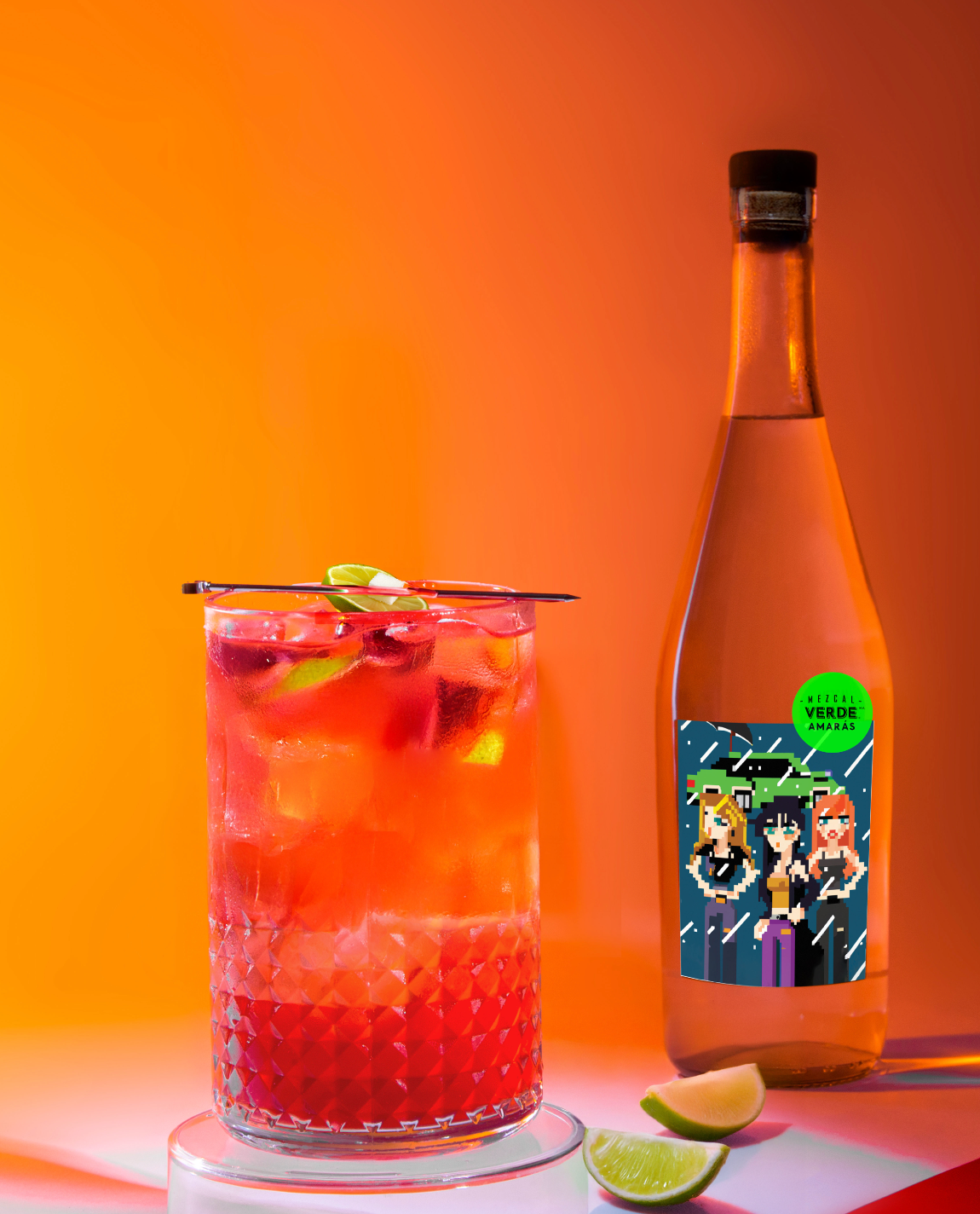 01.Llena una coctelera con hielo, Mezcal Verde Amarás, licor de anís, infusión de jamaica y jugo de limón. Agita rápido y cuela doble en un vaso highball con hielo.