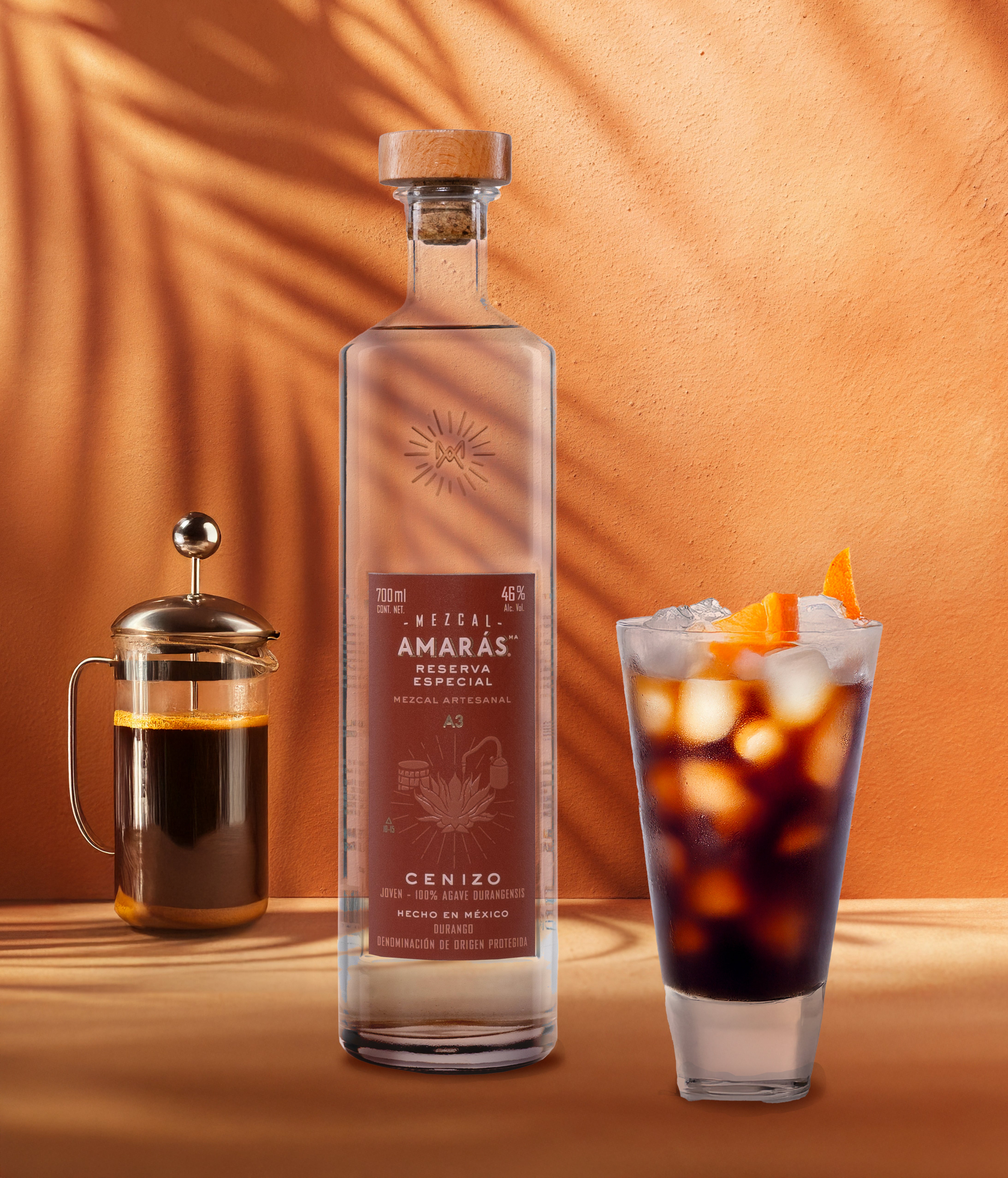 01.Llena un vaso con hielo, vierte Mezcal Amarás Cenizo Reserva Especial, jugo de naranja, licor de naranja triple sec y agua tónica. Revuelve suavemente y decora con un twist de naranja.