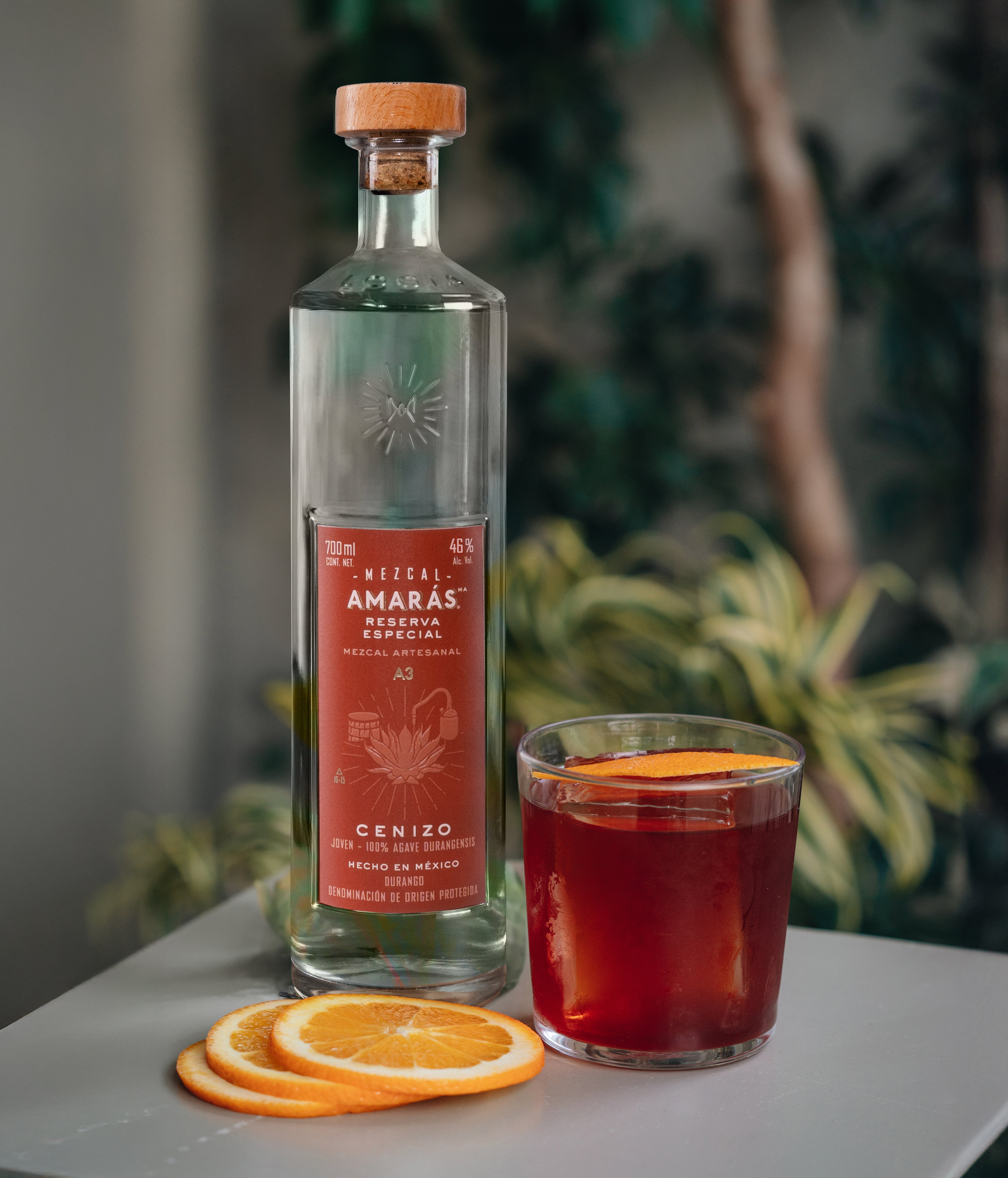 01.Llena una coctelera con hielo, vierte Mezcal Amarás Cenizo Reserva Especial, vermut dulce y el licor amargo infusionado. Agita y cuela en un vaso highball. Decora con una cáscara de naranja.