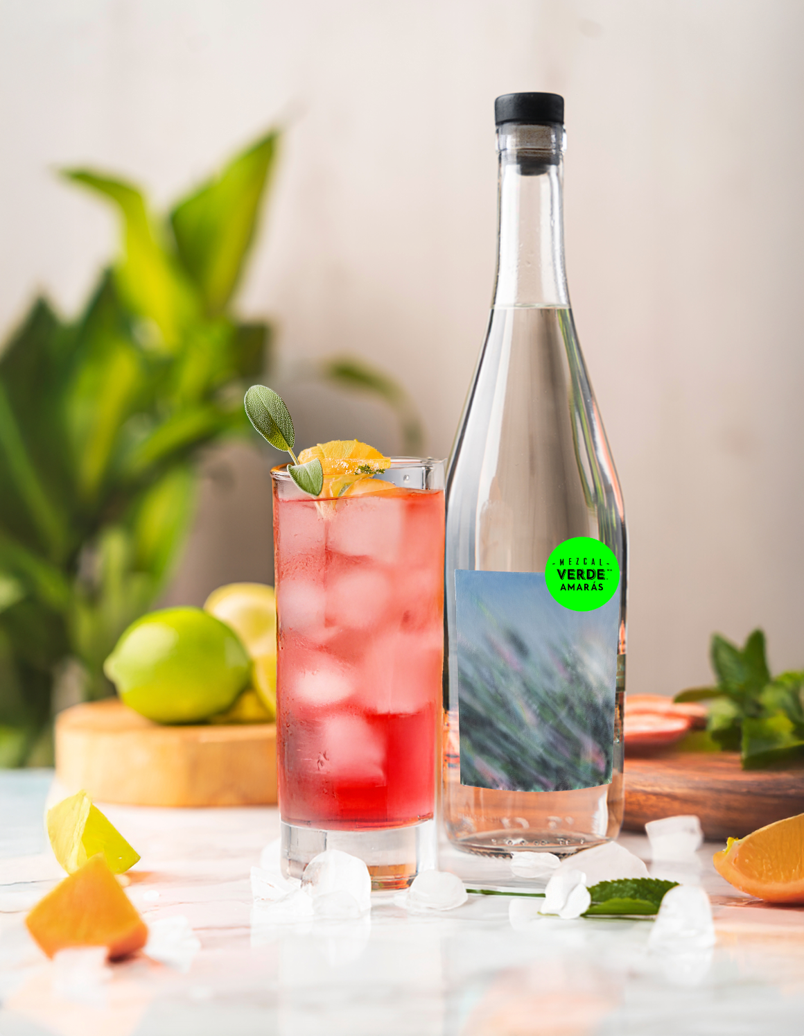 01.Llena un vaso con hielo, vierte Mezcal Verde Amarás, jarabe de jamaica y cerveza de jengibre. Revuelve bien.