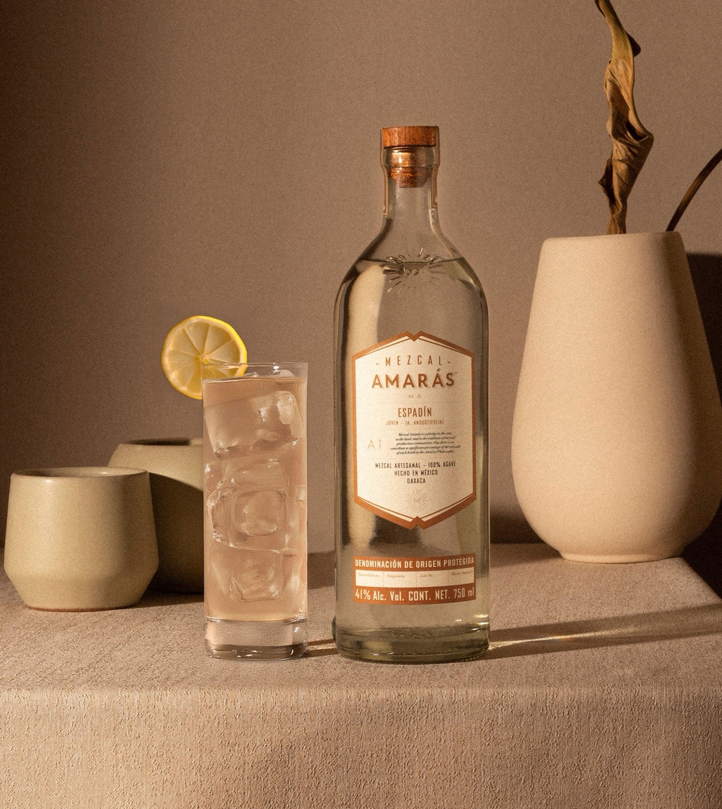 01.Llena una coctelera con hielo, vierte Mezcal Amarás Espadín o Mezcal Amarás Reposado, jugo de limón y té verde helado endulzado. Agita bien y sirve. Decora con una rodaja de limón.