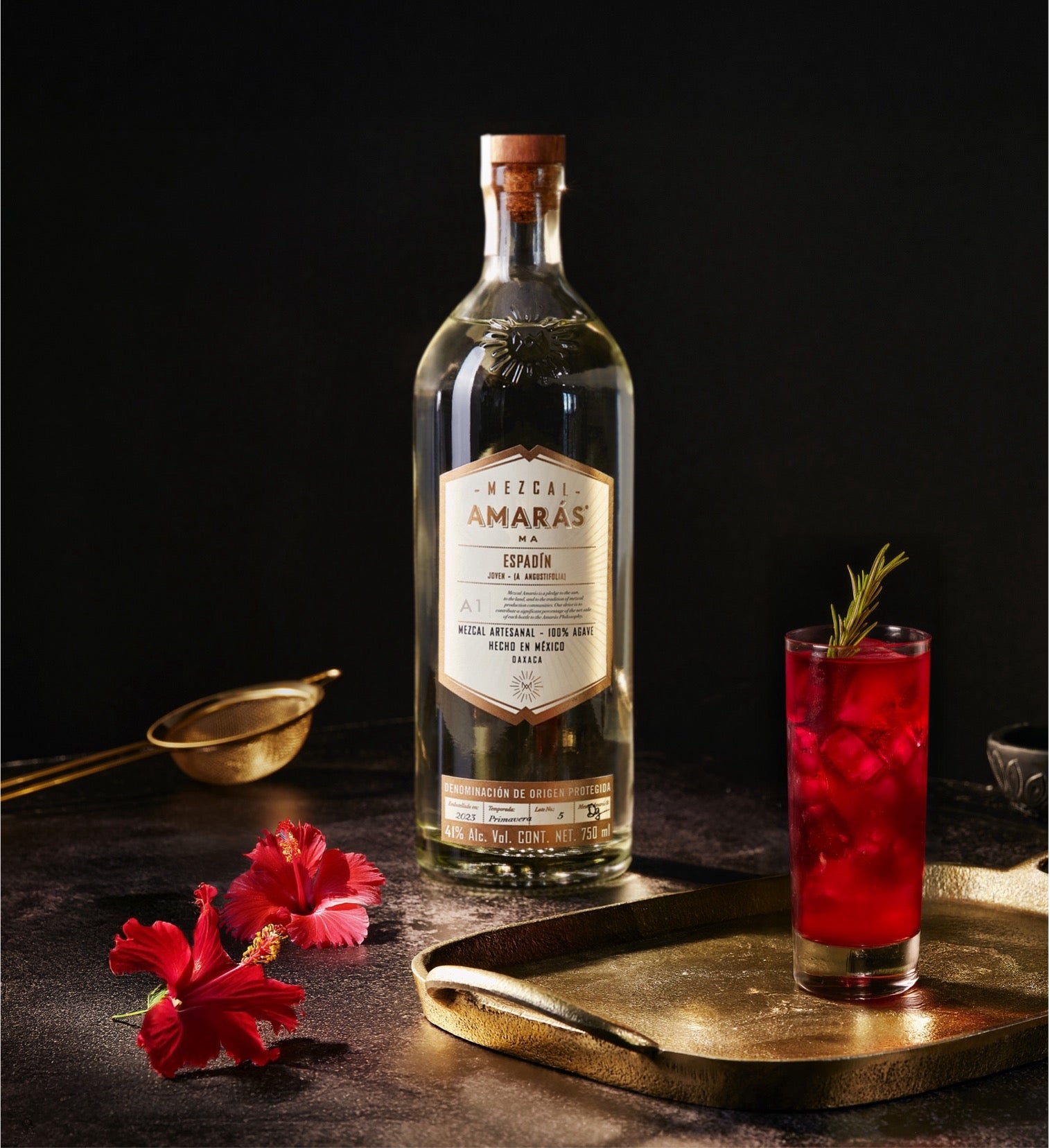 01.Llena un vaso con hielo, vierte Mezcal Amarás Espadín, jarabe de jamaica y refresco de toronja rosa. Revuelve y decora con una ramita de romero.